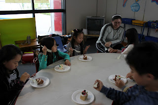 チョコやグミなど、いろんなお菓子を使って、ロールケーキに自分たちで好きなようにデコレーションして楽しみました。